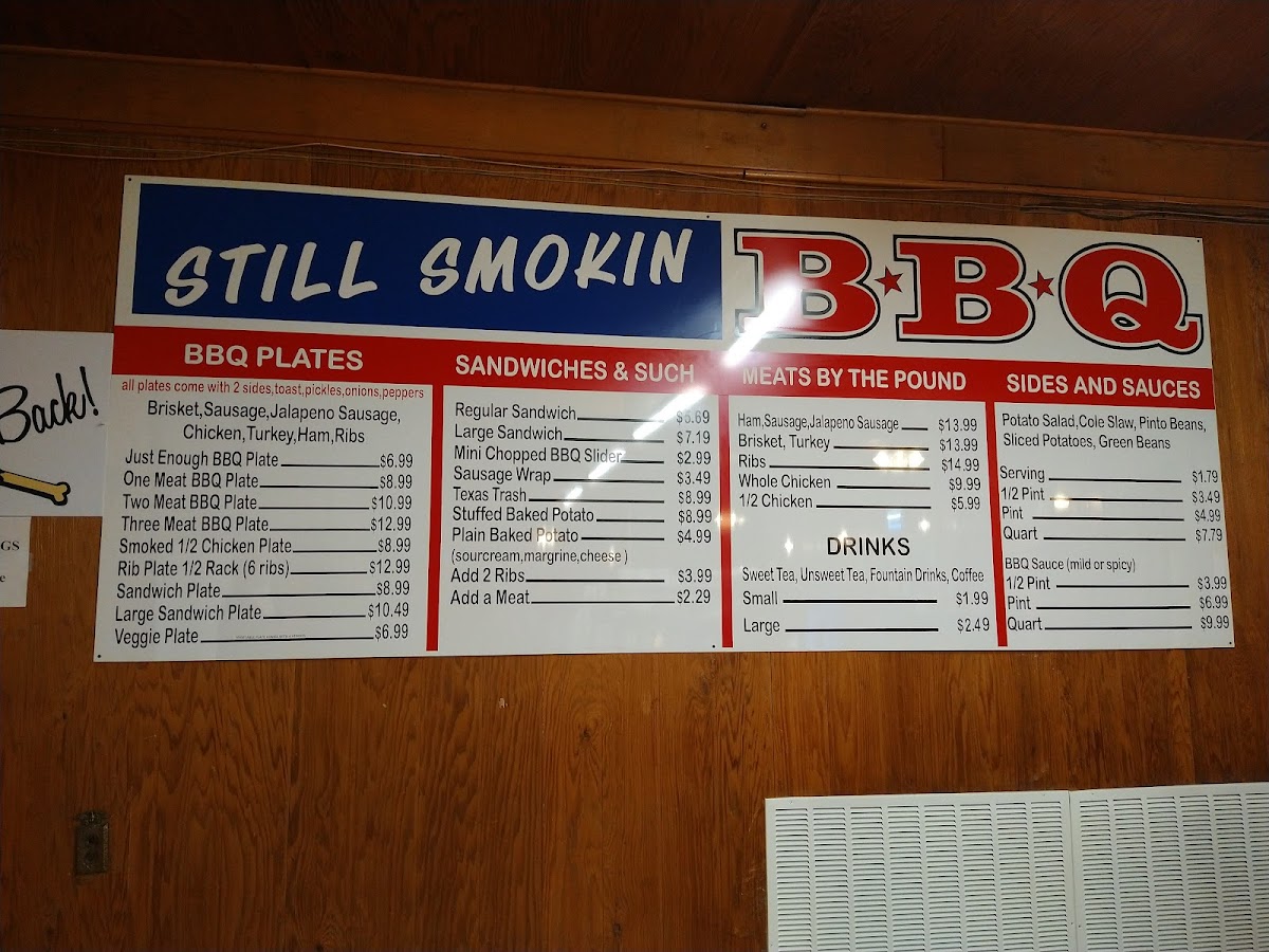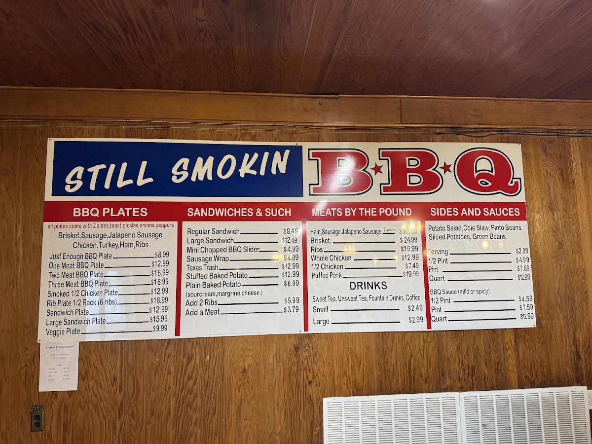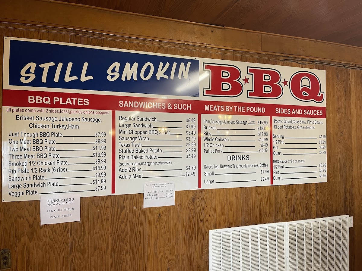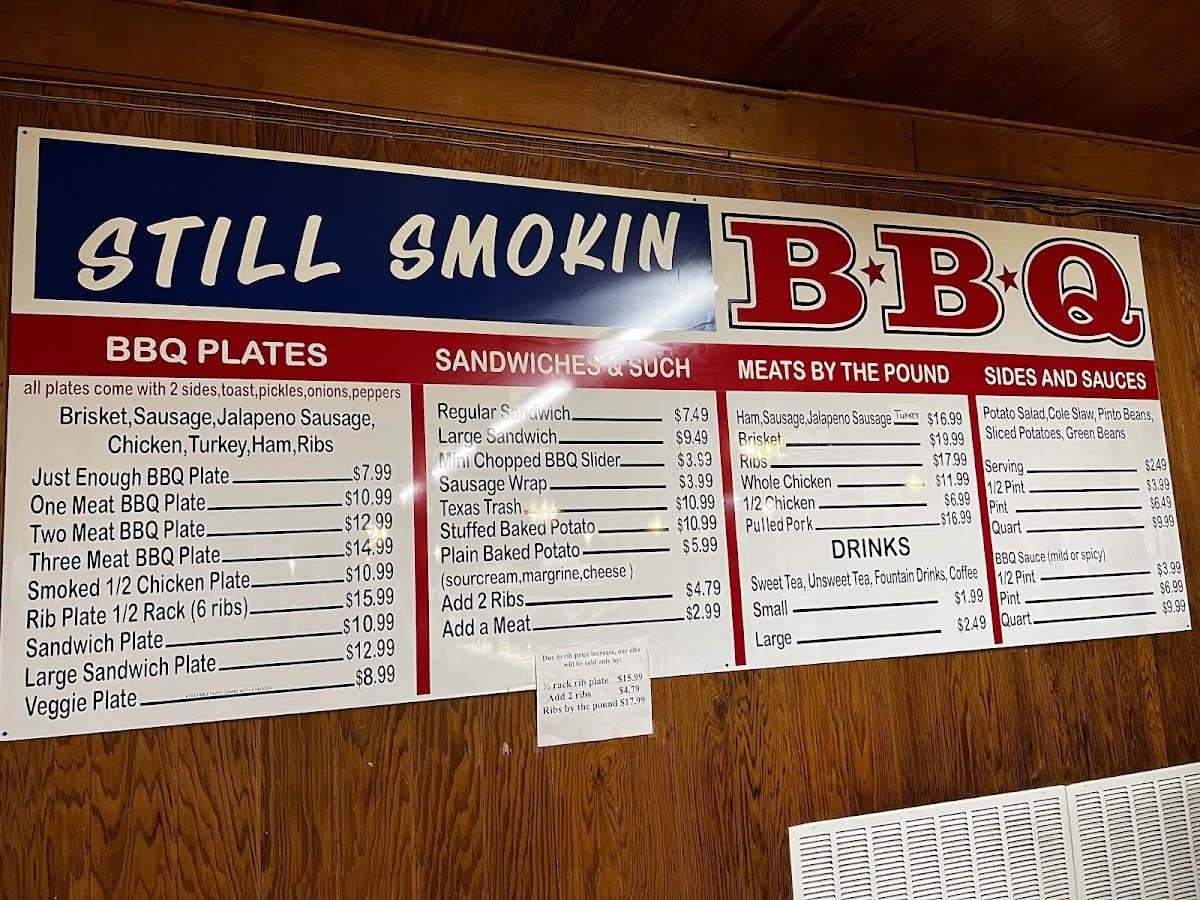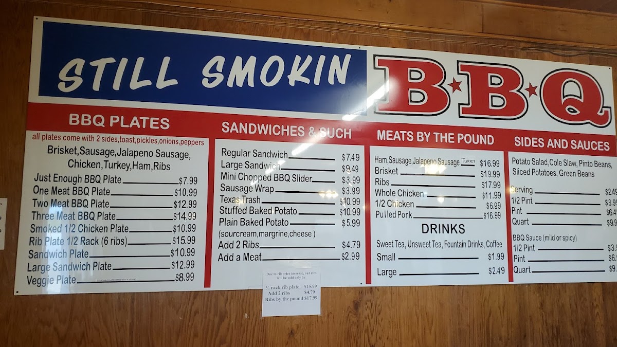Welcome to STILL SMOKIN BBQ, a hidden gem nestled in Abbott, Texas, where barbecue dreams come alive. Located at 212 South Hickory Street, this roadside haven specializes in mouthwatering smoked meats, offering plates that range from a savory Just Enough BBQ Plate at just $6.99 to a hearty Three Meat BBQ Plate for $12.99. Their smoked ½ chicken and succulent rib plates have garnered rave reviews, enticing diners to return for more.