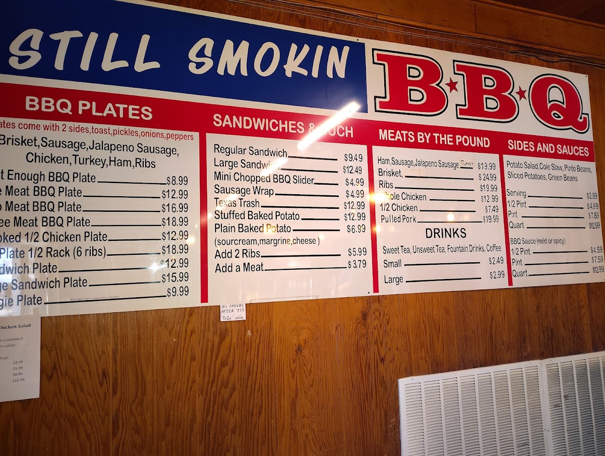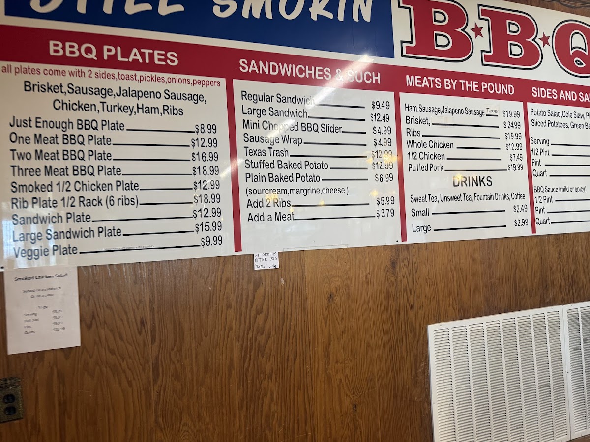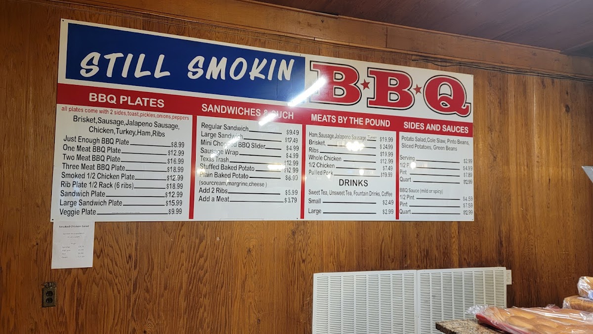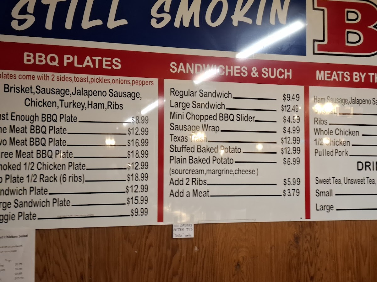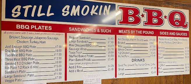 Welcome to STILL SMOKIN BBQ, a hidden gem nestled in Abbott, Texas, where barbecue dreams come alive. Located at 212 South Hickory Street, this roadside haven specializes in mouthwatering smoked meats, offering plates that range from a savory Just Enough BBQ Plate at just $6.99 to a hearty Three Meat BBQ Plate for $12.99. Their smoked ½ chicken and succulent rib plates have garnered rave reviews, enticing diners to return for more.
